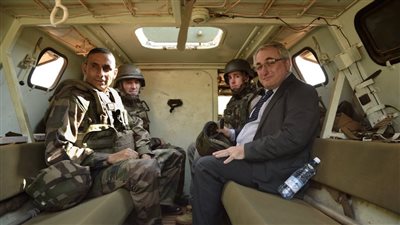 L'ambassadeur de France Charles Malinas (à droite) et le commandant de la force Sangaris, le général Francisco Soriano (à gauche) sont assis dans un véhicule blindé de transport de troupes lors de leur visite à Bossangoa (nord) le 16 janvier 2014. Au moins sept personnes ont été tuées dans des affrontements